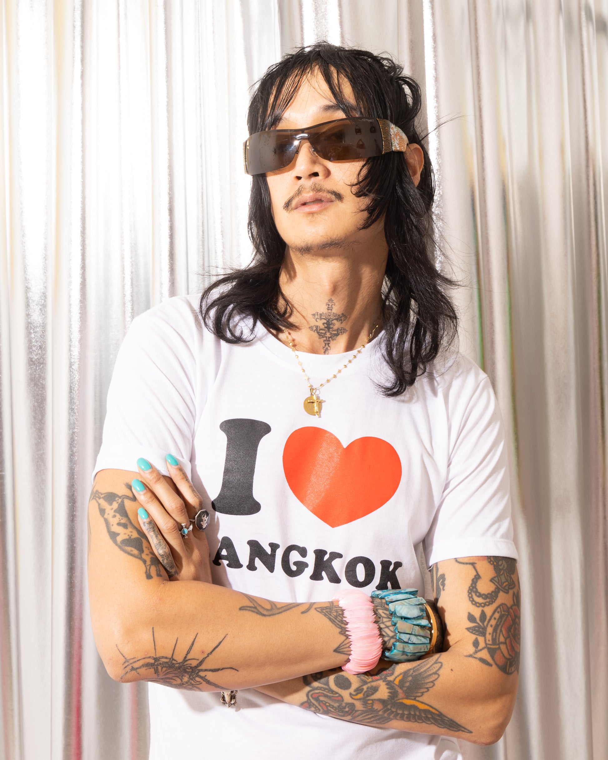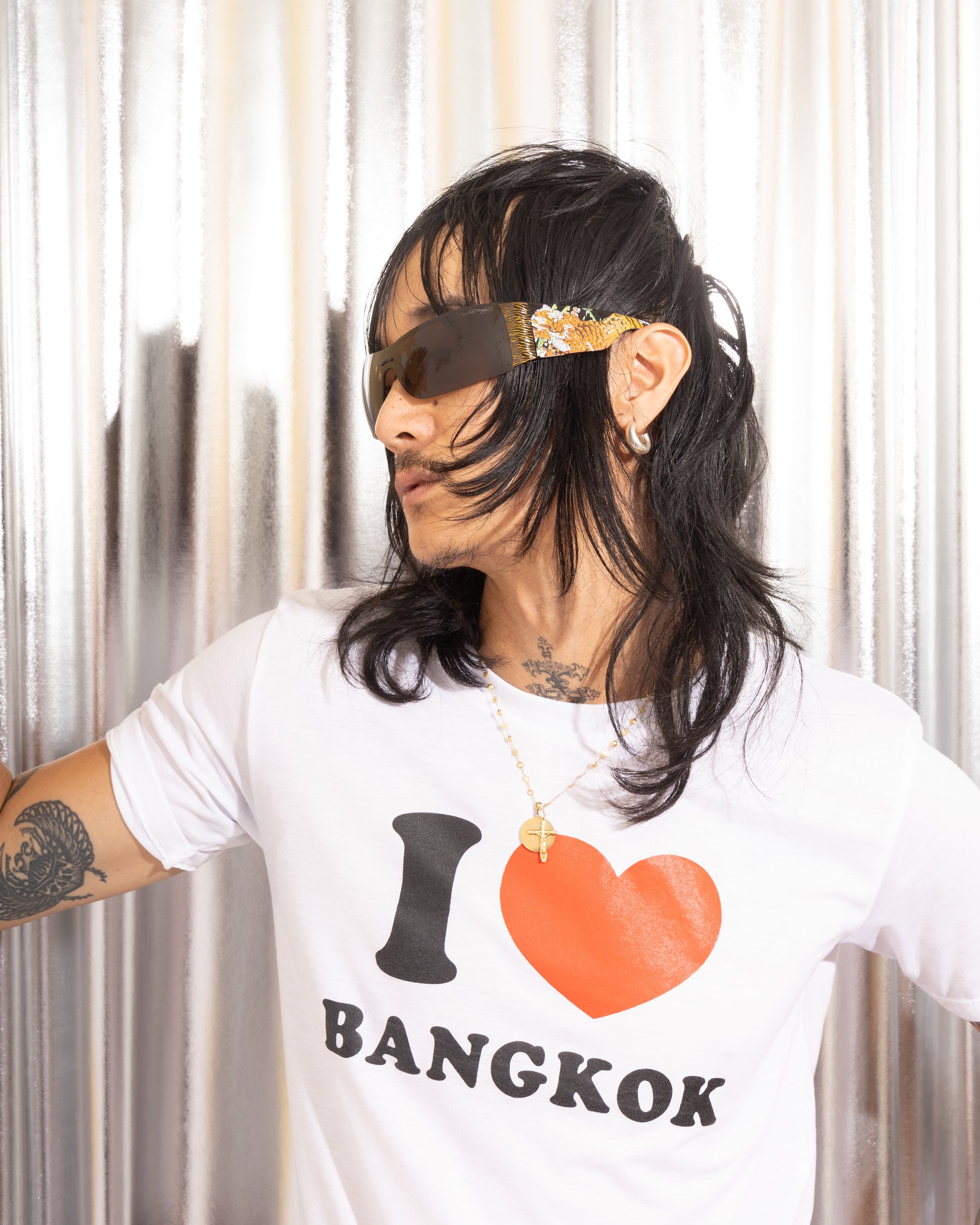Ed Hardy wraparound shield sunglasses, circa mid-to-late 2000s. Featuring a single continuous smoked lens with no visible frame, the arms are printed with a gold-and-floral tattoo-style motif—signature of Ed Hardy’s streetwear peak when the brand’s bold, tattoo-inspired graphics permeated apparel and accessories. The temples integrate a tiger stripe detail into the transition from lens to arm, merging the brand’s maximalist graphics with a streamlined sport-sunglass silhouette.