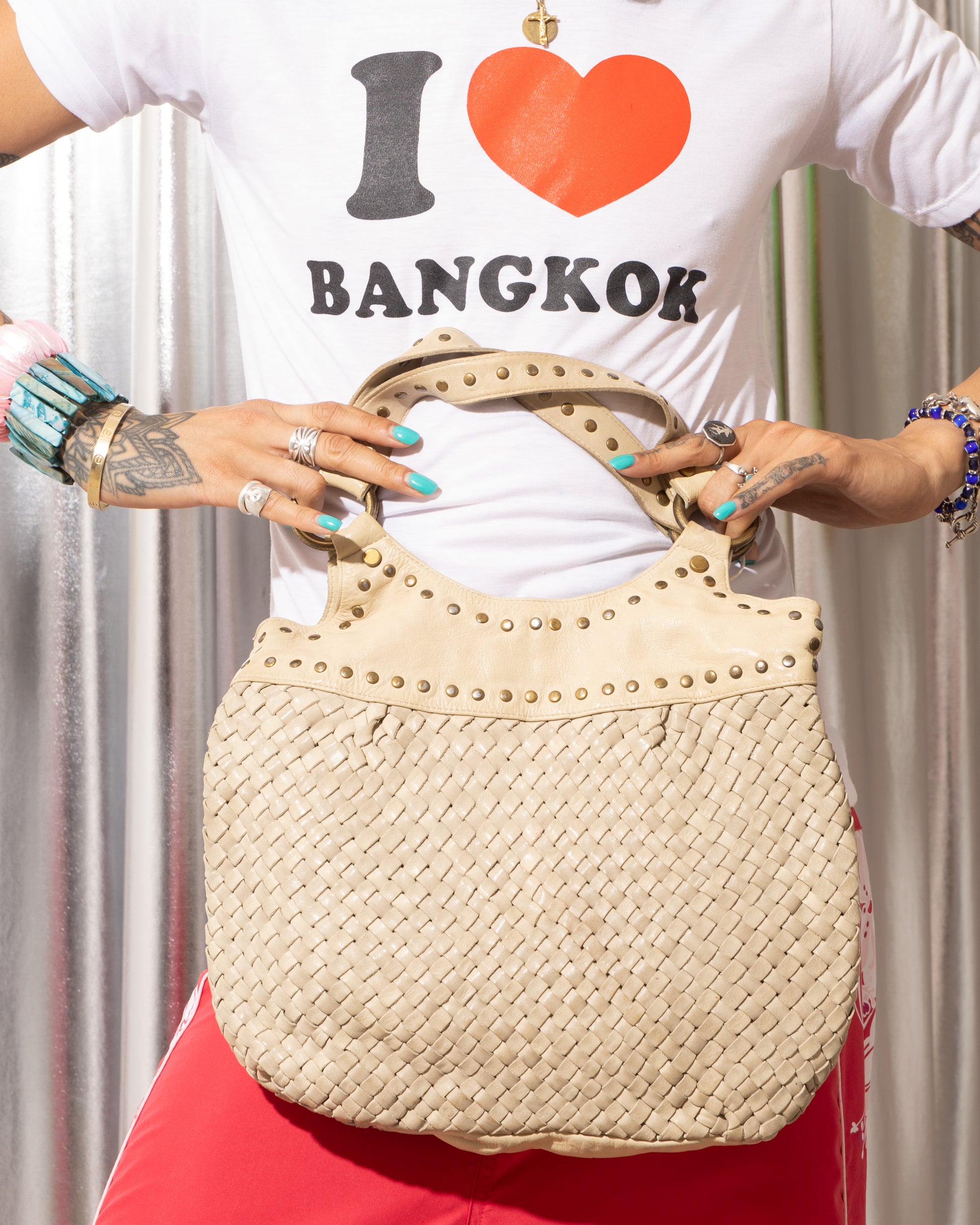 Fossil woven leather hobo, circa late 2000s–early 2010s. Crafted in pale cream leather with a fully woven body, rounded hobo silhouette, and wide handle anchored by oversized brass rings. Stud detailing along the handle and upper panel balances the bag’s softness with subtle hardware edge.