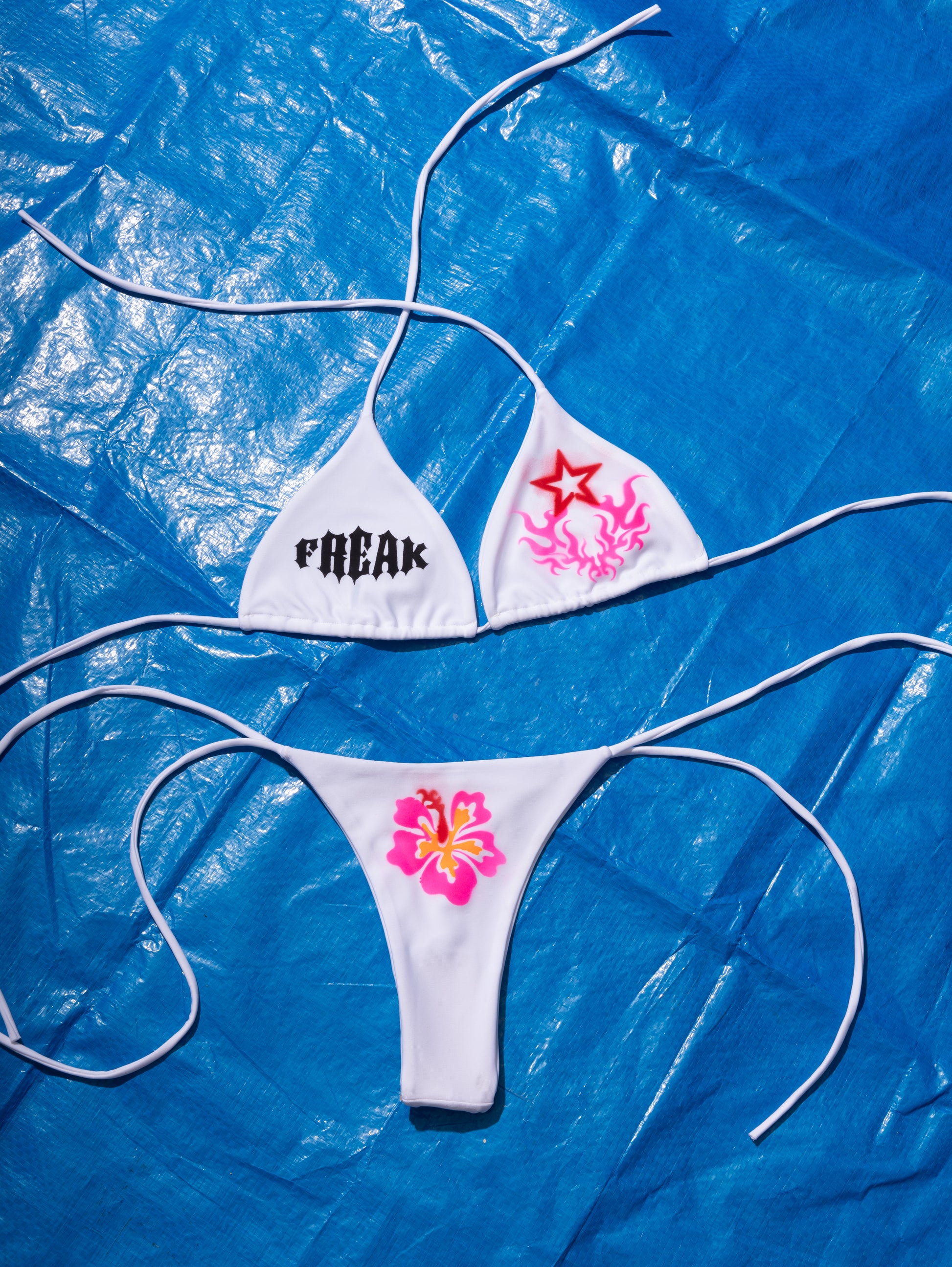 THESE FREAKINI'S ARE HAND AIRBRUSHED AND SCREEN PRINTED, ALL BY US. STRING BIKINI, TOP AND BOTTOM FOR ADJUSTABLE SIZING. BOTTOMS ARE A THONG CUT.