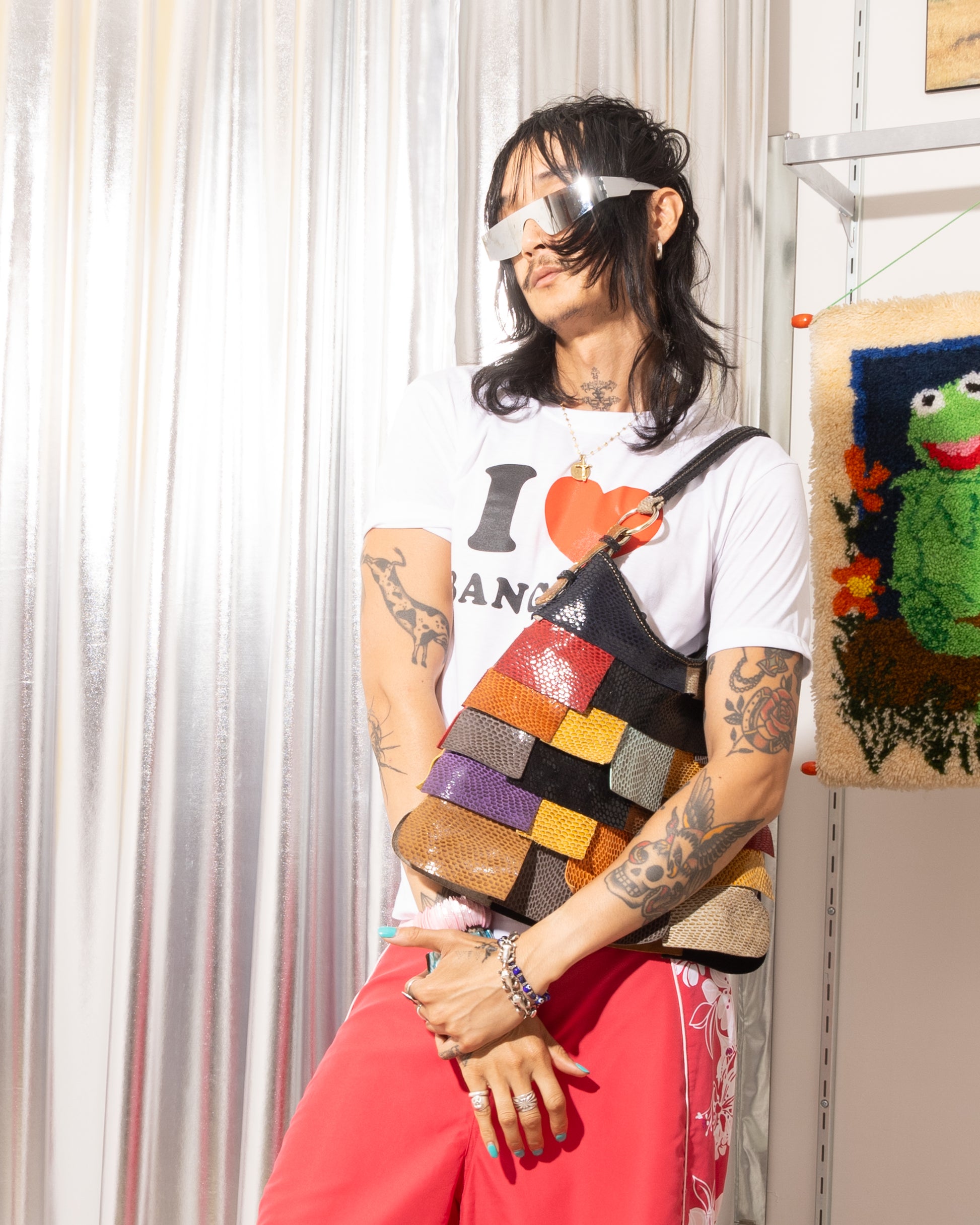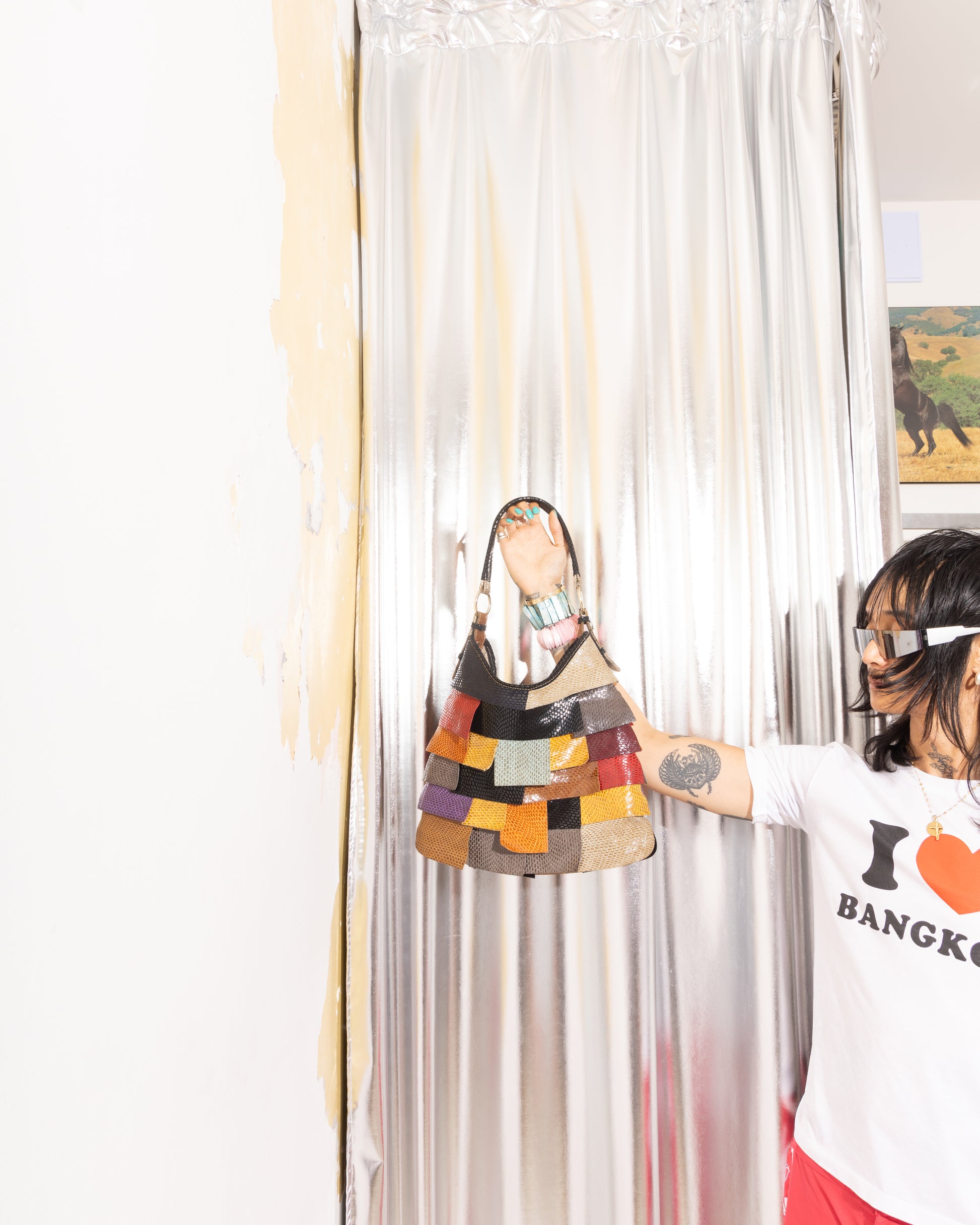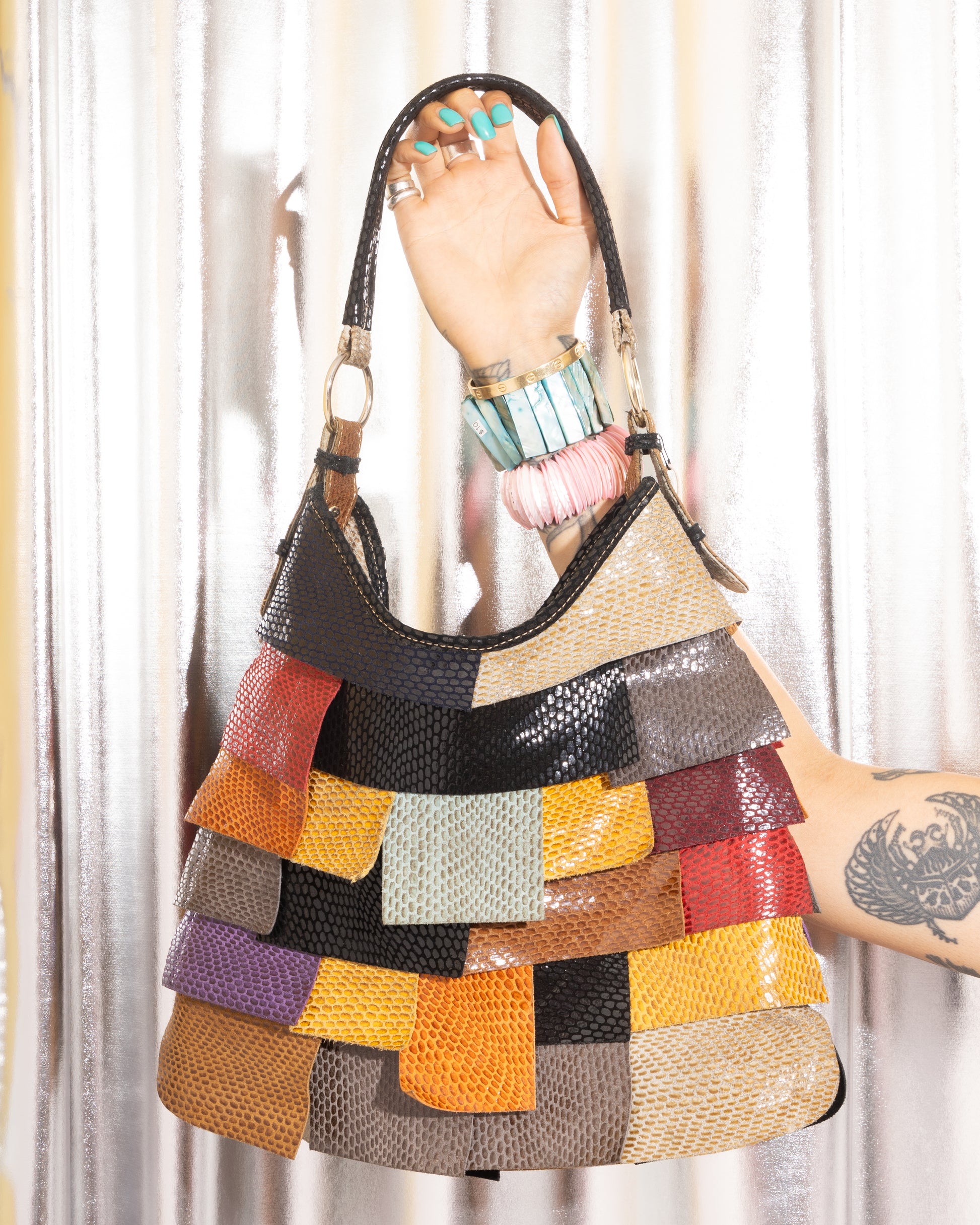 In the current fashion cycle, similar elements are resurfacing at both luxury and indie levels. Bottega Veneta’s recent seasonal palettes and intrecciato textures echo the tactile variety here, while Chloé and Isabel Marant have revisited patchwork leather as part of the broader Y2K and bohemian revival. This bag’s stacked panel construction also mirrors the sculptural, layered approach seen in some contemporary JW Anderson and Marni designs, making it both a period piece and a relevant styling choice today.