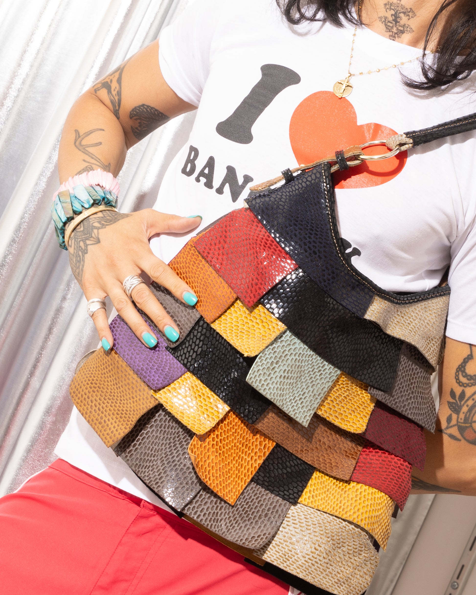 Genuine leather patchwork hobo. Composed of tiered rectangular panels in textured leather, each in a distinct shade—mustard yellow, oxblood, camel, black, grey, cream, purple, and burnt orange—stitched into cascading rows. The silhouette is softly curved with a single shoulder strap and minimal hardware, letting the layered colour and texture become the focal point.