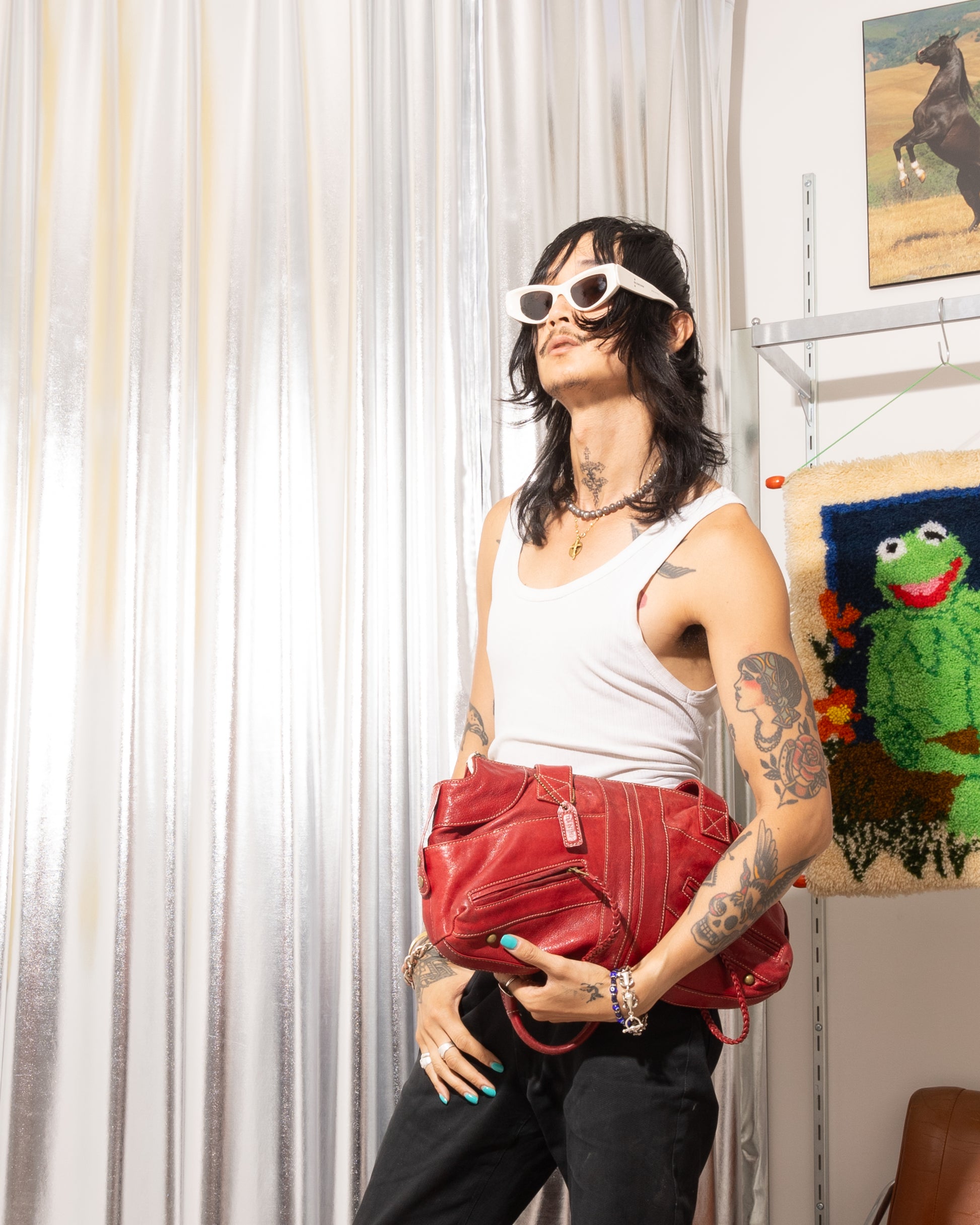 This deep red Italian leather Danier shoulder bag is the definition of Y2K chic. Made from buttery-soft leather with bold contrast stitching, it’s loaded with woven zipper pulls, angled pockets, and that perfect slouchy-but-structured silhouette.