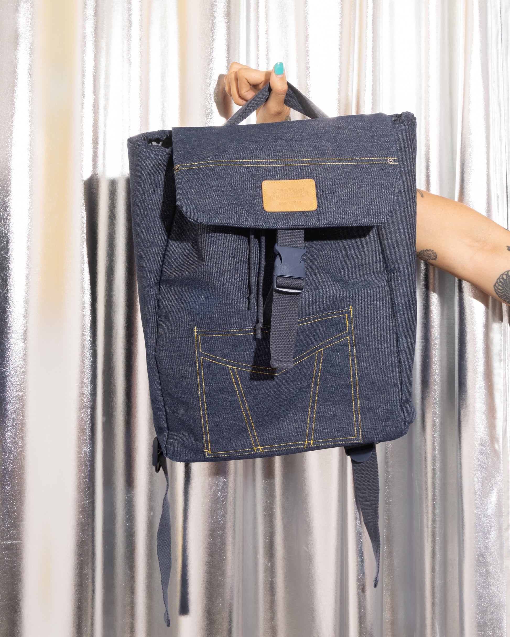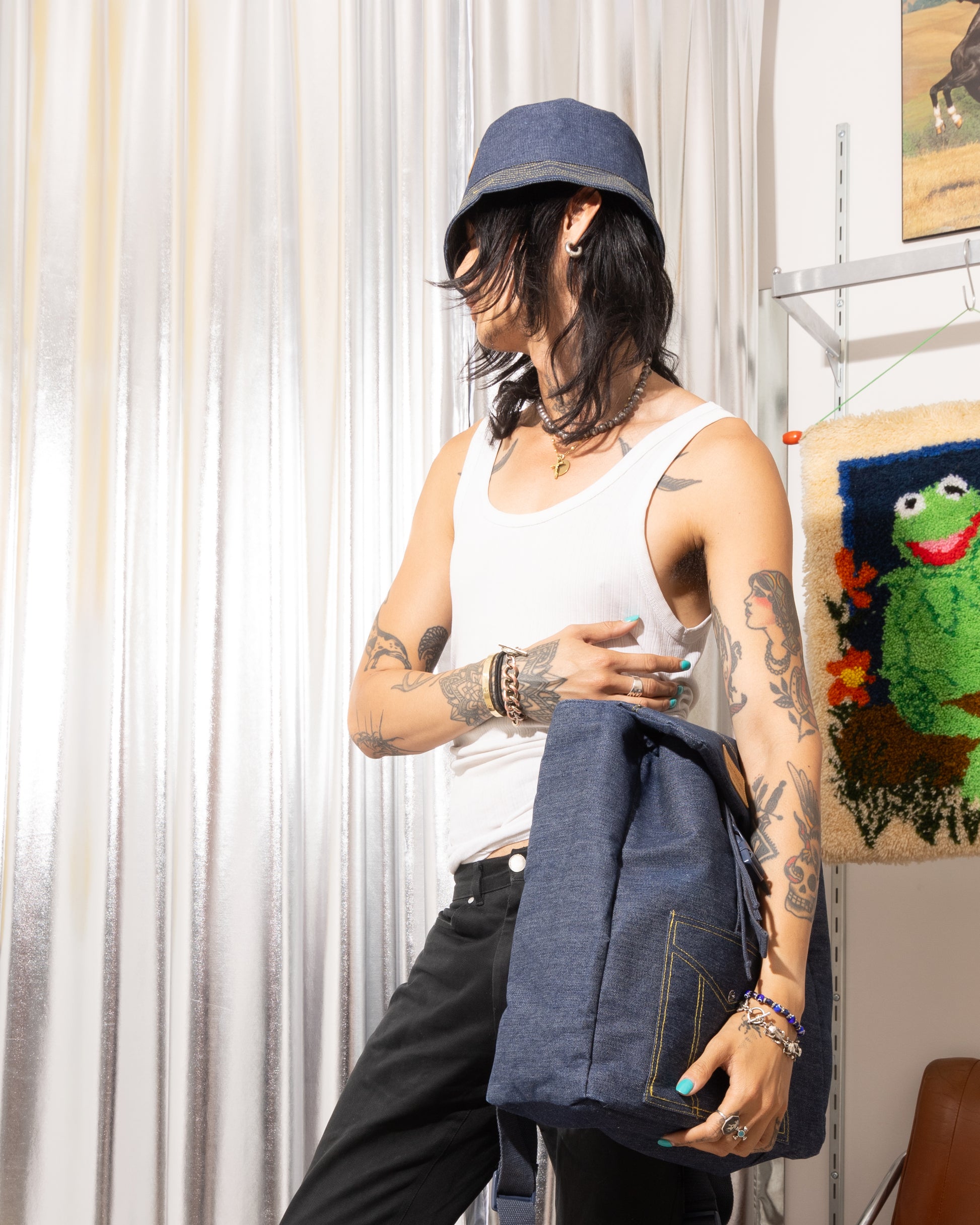 Jean Paul Gaultier 'Pour Vous' denim backpack, circa late 2000s. Constructed in deep indigo denim with contrast gold topstitching, featuring a fold-over flap secured by a webbing strap and buckle closure. The front is marked by signature angular seamwork reminiscent of Gaultier’s deconstructed tailoring approach, paired with a tonal denim bucket hat for a coordinated look. Branding appears on a rectangular patch at the top flap—subtle yet distinctly in line with the label’s ready-to-wear accessories of the period.